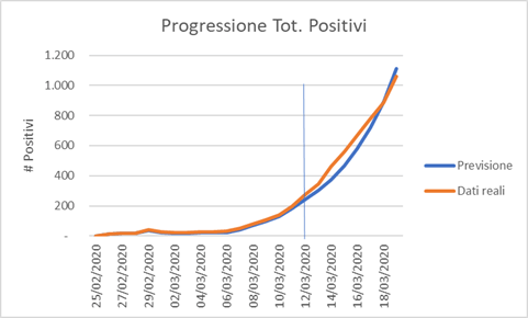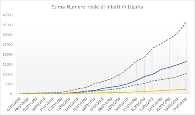 Stabilito il parametro di crescita (1,20419), e valutato che, anche considerando tempo di incubazione (+6 giorni) e casi non documentati (86,2% del totale), si stavano stimando 5.136 casi, quindi lo 0,32% della popolazione Ligure, potevamo proiettare i giorni successivi sapendo che la crescita non sarebbe stata limitata, e la pendenza sarebbe stata coerente almeno fino al 17/19 di marzo, dato che le misure prese il 9 marzo e il 12 marzo non avrebbero avuto effetto nei numeri visto il tempo di incubazione stimato.