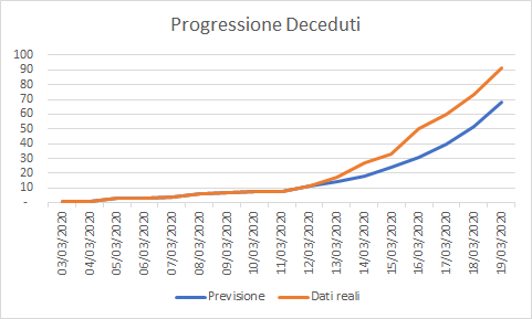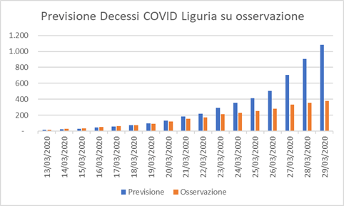 Confronto deceduti previsti / reali COVID-19 in Liguria al 19 di marzo
