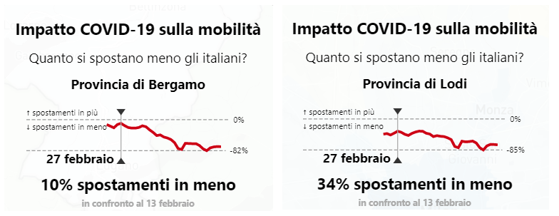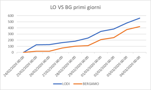 A Lodi gli spostamenti erano già molto ridotti: -34%, la metà della media attuale, mentre a Bergamo si rileva una riduzione ma non ancora consistente (Sarebbe arrivata al 34% in meno 1 settimana dopo, il 7 di marzo). Questa differenza nei tempi di applicazione delle misure porta a risultati nella progressione e nel numero dei contagi molto diversi: