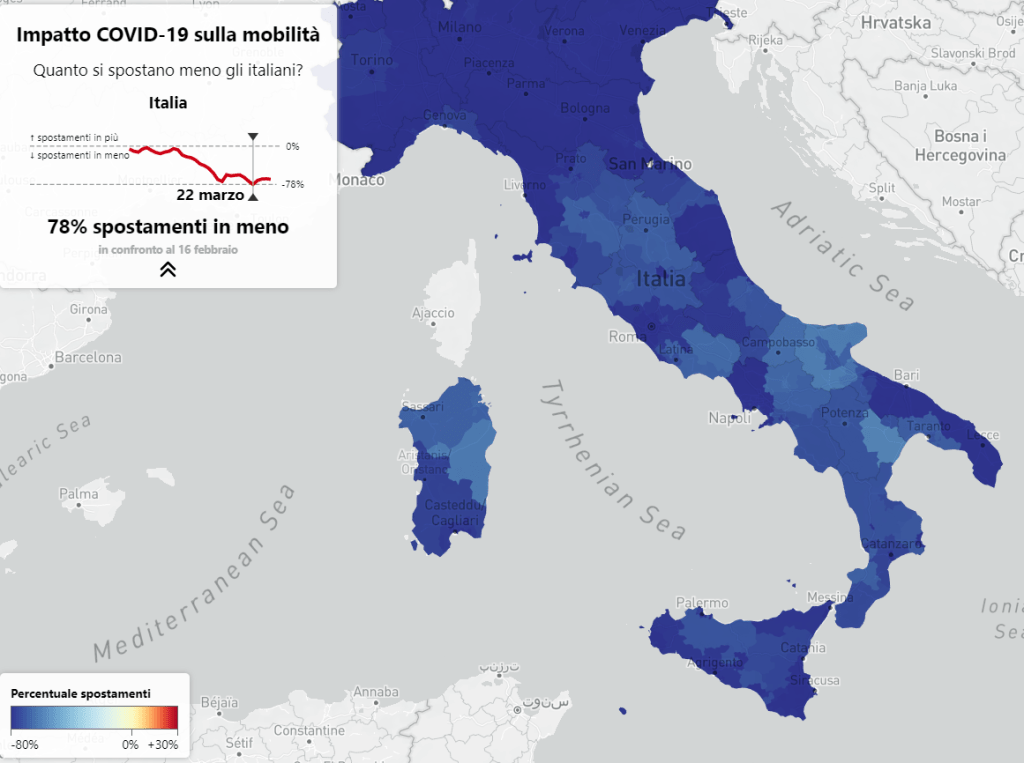 Oltre al lockdown (inteso come chiusura di attività commerciali, ludico-ricreative e scolastiche), è stata definita anche una misura di restrizione al movimento fra comuni diversi. Queste misure hanno ridotto enormemente la mobilità nella nostra nazione, ed i risultati sono stati evidenti e sostanziali, come mostrato molto bene, oggi, in un articolo dotato di mappe interattive di Repubblica (bravi!).